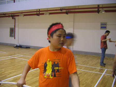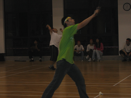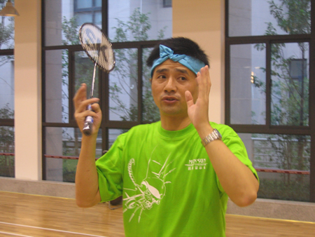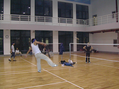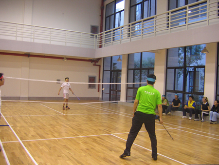 <圖4>首先進(jìn)行的是羽毛球比賽,孫經(jīng)理VS張翼。大家仔細(xì)看看,這可是右手與左手的對絕哦!