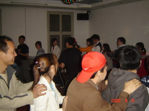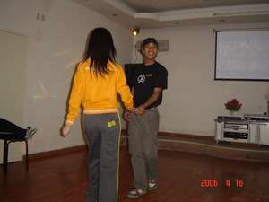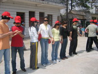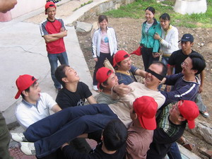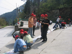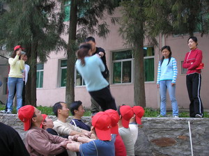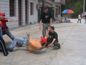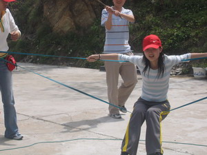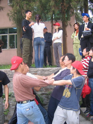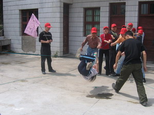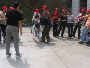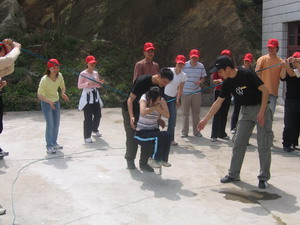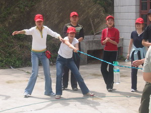 雷陣取水(在一個直徑4米的地面中間有一個裝滿水的杯子(作為假設的地雷),我們有的工具就是繩子和人,并且繩子和人都不能接觸圈內(nèi)的地面的情況下取出杯子,而且滴水不能灑。想一想可能嗎?當然可以,團隊的智慧和潛力是不可估量的。我們在5分鐘的時間里做出了8種方案,利害吧:)