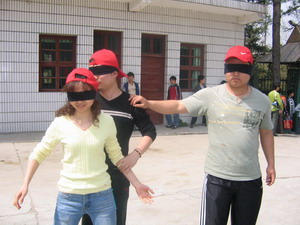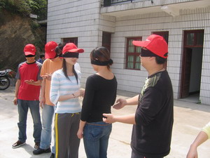 盲人摸號(每隊選出9個成員均戴上眼罩,每人一個號,此號只有本人知道。小組成員在“全盲全啞”狀態(tài)下,根據(jù)每人的號數(shù),按從小到大的順序排列出一條直線。全盲全啞?那怎么溝通呀?聽起來有點兒難度哦,但武漢商科人果然聰明,雖然中間出了一點兒小差曲(有人差點兒偏離隊伍),但兩個隊均在7分鐘和8分鐘內(nèi)準確的排列出順序,是一點兒不差哦。教官都說我們的成績是相當不錯呀。唉,不得不佩服我們自己呀。^-^)
