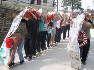 鐵甲戰(zhàn)車(記得坦克是怎么前行的嗎?軸帶動履帶向前進。教官“丟”給我們每個隊一小疊報紙和一小圈透明膠。有限的資源,50米的距離,報紙為“履帶”,人為“滾軸”, 我們要前行啦!)