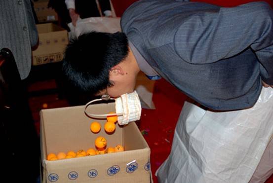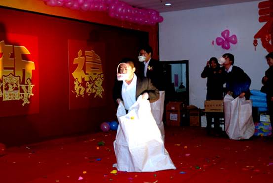 真正考驗(yàn)大家的時(shí)候到了,下一個(gè)游戲項(xiàng)目是運(yùn)球接力賽,主持人宣布每桌派出三名同事上臺(tái),根據(jù)規(guī)定必須用嘴咬住籃子,將小球從舞臺(tái)的一邊運(yùn)輸?shù)綄?duì)面一邊的椅子上,而且必須把自己裝進(jìn)布袋里前進(jìn),這個(gè)難度可真不小啊!