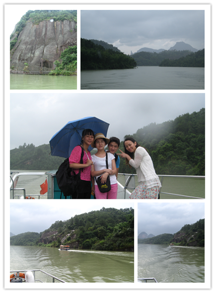 參觀完了元陽石風景區(qū),接下來就是“錦江游船”了,坐在游船上,欣賞著 “錦江畫廊”,大雨忽至,卻一點都不影響大家游玩的心情,隨著船上導(dǎo)游風趣的講解,同事們這邊跑,那邊轉(zhuǎn)的,相機沒有一刻停歇,丹霞美景集中展現(xiàn),金龜朝圣、鯉魚跳龍門、、六指擒魔、觀音送子、笑面佛、茶壺峰、拇指峰、仙山瓊閣等美景點綴兩岸,目不暇接,群峰呈態(tài),妙不可言,當然,這個也要考大家的眼力和想象力了。