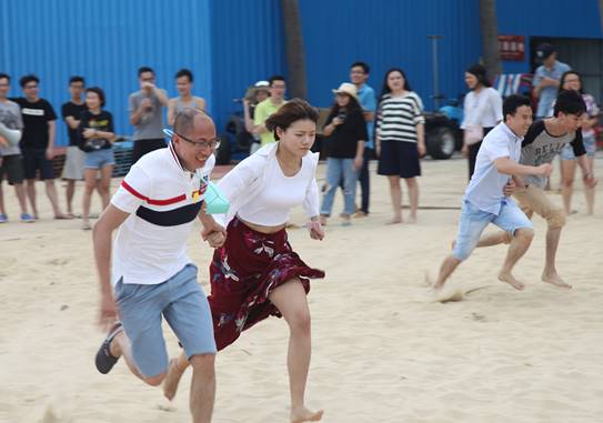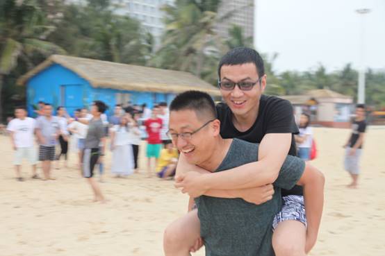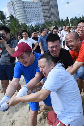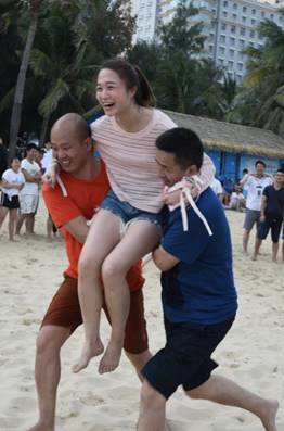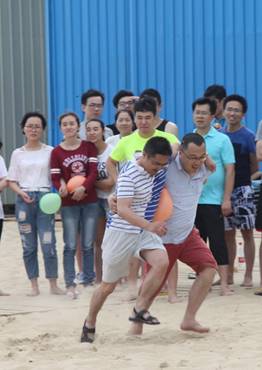 接下來是歡樂的趣味接力活動啦,這一環節講究的不僅是速度,隊員的配合也十分重要。雙人夾氣球、背人跑、雙人咬紙巾、抬人跑、轉圈跑,大家玩的不亦樂乎,加油聲、呼喊聲、笑聲充斥著整片沙灘!