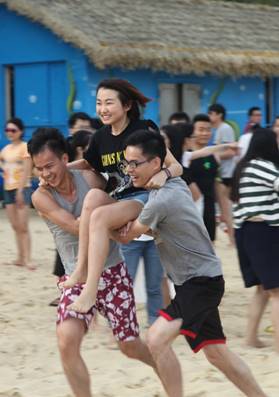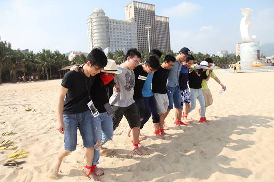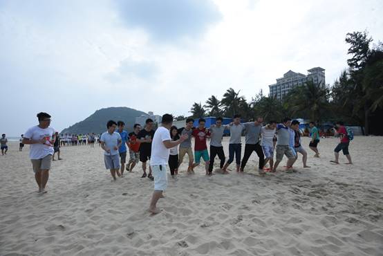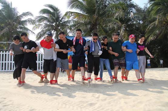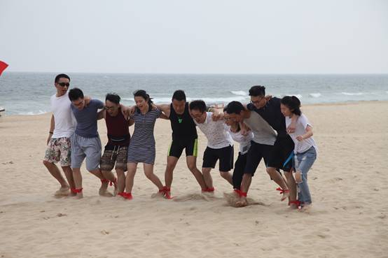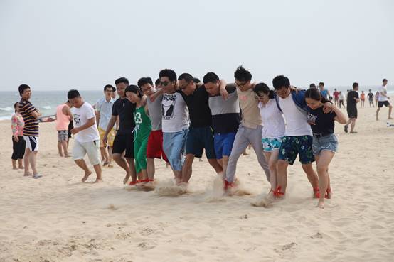 “一二、一二……”,陣陣呼喊聲傳來,拔河之后,考驗默契的十人十一足比賽開始了。隊員們肩并肩,邁著整齊有力的步伐,向著目標沖去。盡管腳踝勒出了紅痕,盡管途中有摔倒,但是各組仍奮勇向前,成為海灘上最亮麗的風景線。