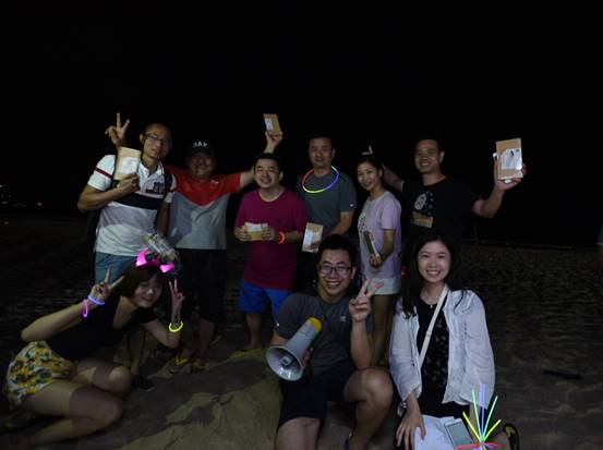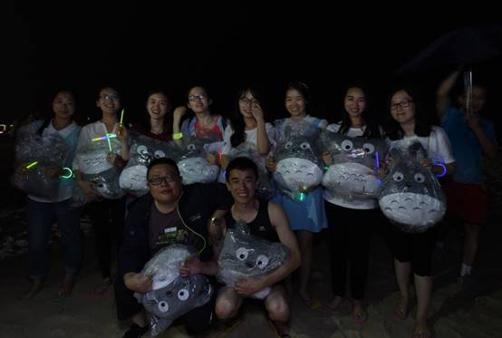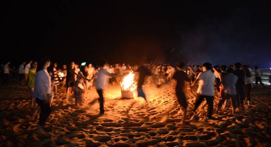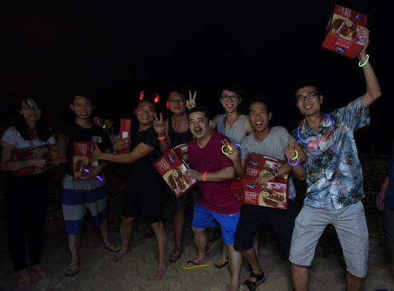 到了海邊,除了體驗美麗的海島風情,當然還要享受海鮮大餐,魚蝦蟹貝,美味的晚餐盛宴,讓大家大飽口福。大快朵頤之后,開始了篝火晚會。在海灘上,伴著陣陣的濤聲,歡快的音樂聲,大家挽著手,環成圈,跑著,跳著,忘卻一切壓力與煩惱,盡情歡暢。期間,還對下午比賽勝出的隊伍進行了頒獎,沒有獲獎的隊伍也不要沮喪喲,你們都是最棒的!