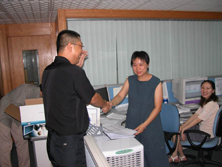 圖中是人事部紀經理代表公司總經辦將新購買的顯示器親自督促并將移交到有這位準媽媽的部門。