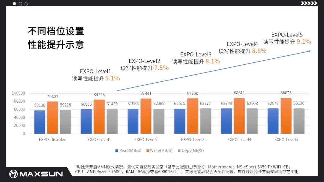 據(jù)銘瑄實驗室實測,開啟MMM模式Level5后對比未開啟MMM模式,讀寫性能提升9.1%,延遲減少14.8%,性能提升表現(xiàn)卓越(注:實際性能表現(xiàn)因硬件配置、軟件環(huán)境等多方面差異而存在變化,因架構(gòu)差異原因,銳龍8000系列不支持該功能)。