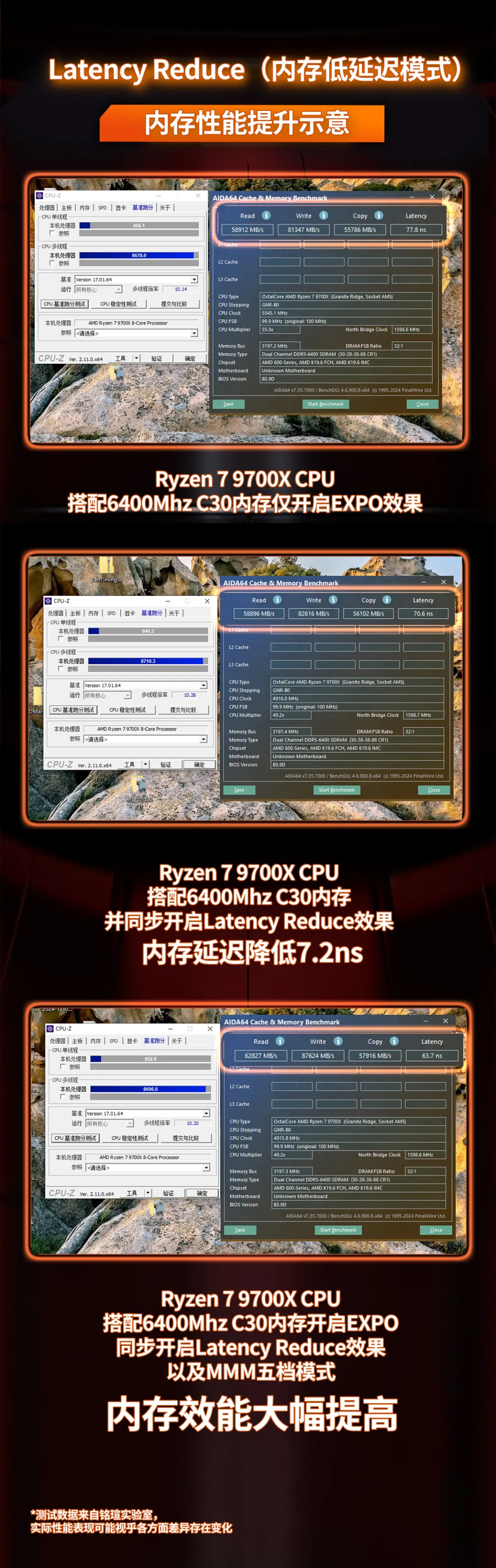 針對Ryzen 9000系CPU內(nèi)存延遲提高,銘瑄專門開發(fā)新功能幫助提升系統(tǒng)效能——Latency Reduce(內(nèi)存低延遲模式)。該功能主要針對內(nèi)存延遲進行優(yōu)化,開啟后將進一步提升內(nèi)存性能,另外此功能還可搭配MMM銘瑄內(nèi)存大師同時使用,以達成更高內(nèi)存效能。