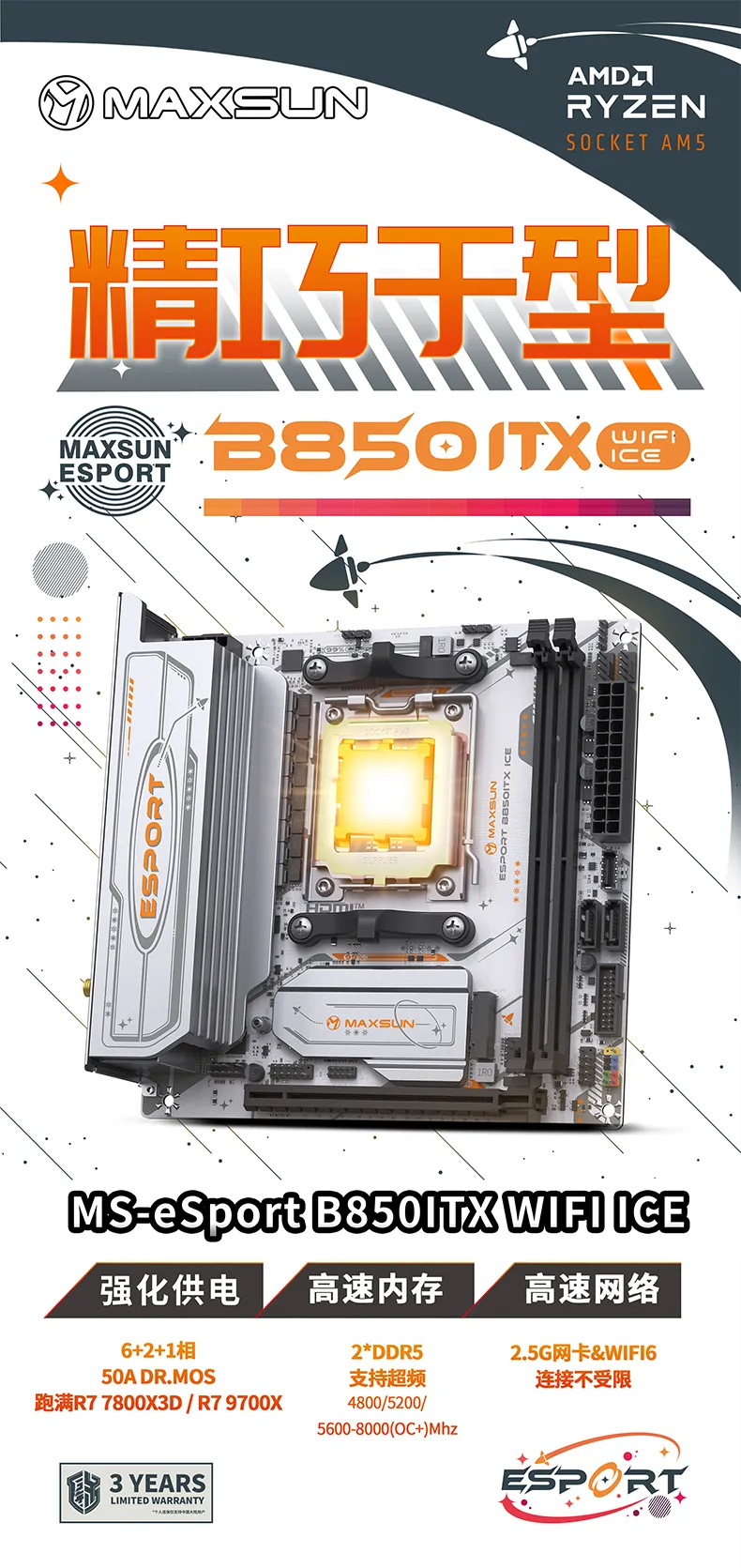 MS-eSport B850ITX WIFI ICE,特別為想要組建迷你主機的硬核玩家打造,ITX版型,精巧于型,6+2+1相50A Dr.Mos供電,穩(wěn)定釋放性能,超頻能力同樣高達8000MHz+,配備2.5G有線網(wǎng)卡和WIFI6無線網(wǎng)卡,帶來又快又穩(wěn)的網(wǎng)絡(luò)連接體驗。