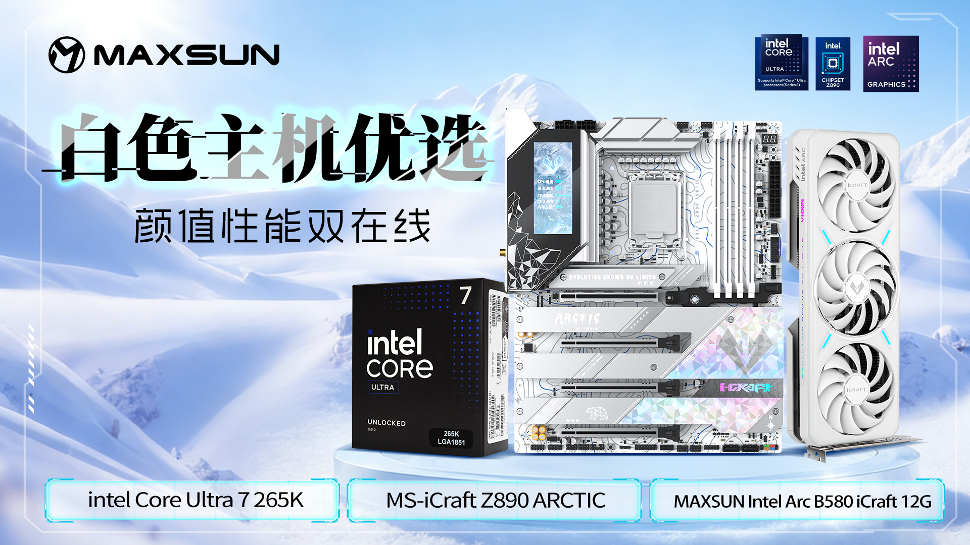 《戰地6》的冰雪戰場已全面開啟,更公平的對戰機制、更沉浸的戰斗體驗、更豐富的玩法內容,都在等待玩家探索。英特爾酷睿Ultra 7 265K處理器搭配銘瑄iCraft Z890 Arctic主板與MAXSUN Intel Arc B580 iCraft 12G顯卡,這套“冰刃組合”既是顏值與冰雪主題的完美契合,更是性能與體驗的保障,讓你馳騁冰雪戰場,玩轉各類重負載任務,彰顯獨特個性。現在就升級你的硬件裝備,帶著這套 “冰刃三件套”, 在《戰地 6》的冬日戰場中橫掃千軍,迎接全新挑戰吧!