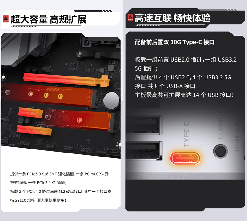 擴展能力方面,更是做到了 “全場景覆蓋”, 讓拓展需求無需妥協(xié)。該主板提供一條PCle5.0 X16 SMT強化插槽、一條PCle4.0 X4開放式插槽、一條PCle3.0X1插槽;板載2個PCle4.0協(xié)議滿速M.2硬盤接口,其中一個接口支持 22110 規(guī)格,更大更快更耐用。且接口十分豐富,擁有前后置雙10G 速率Type-C接口,可擴展高達(dá)14個USB接口,大大提高了擴展能力,無論是連接高速外設(shè)、多屏顯示還是充電需求,都能輕松應(yīng)對,全板無沖突設(shè)計讓拓展更隨心所欲。