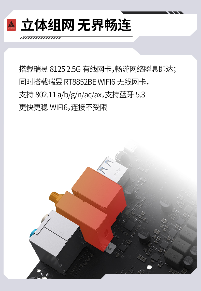 網(wǎng)絡(luò)體驗是電競玩家的 “生命線”,該主板搭載瑞昱8125 2.5G有線網(wǎng)卡,暢游網(wǎng)絡(luò)瞬息即達(dá);同時搭載瑞昱RT8852BE WIFI6無線網(wǎng)卡,支持802.11 a/b/g/n/ac/ax,支持藍(lán)牙5.3。更快更穩(wěn)WIFI6,連接不受限。像在《三角洲行動》這類多人在線競技游戲中,穩(wěn)定且高速的網(wǎng)絡(luò)能夠確保游戲延遲始終保持在較低水平,避免因網(wǎng)絡(luò)卡頓導(dǎo)致操作失誤,讓玩家盡情享受游戲樂趣。