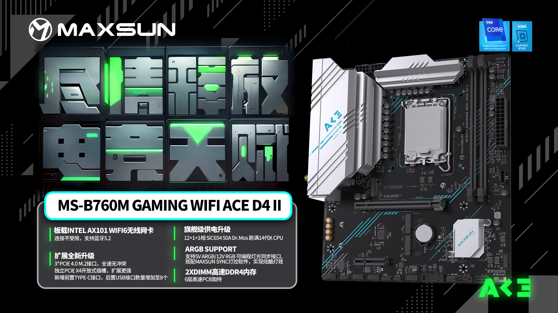 英特爾酷睿i5-14600K處理器,配備14核20線程(6性能核+8能效核)的架構設計,基礎頻率3.5 GHz,最高睿頻5.3 GHz,無論是馳騁主流 3A 大作的戰場,還是應對視頻編碼、3D 渲染等高強度生產力任務,它都能游刃有余。強悍的處理器,離不開一款供電扎實、拓展全面的主板來保駕護航,銘瑄 B760M GAMING WIFI ACE D4 II 主板恰好切中這一核心需求,為處理器性能釋放筑牢根基。