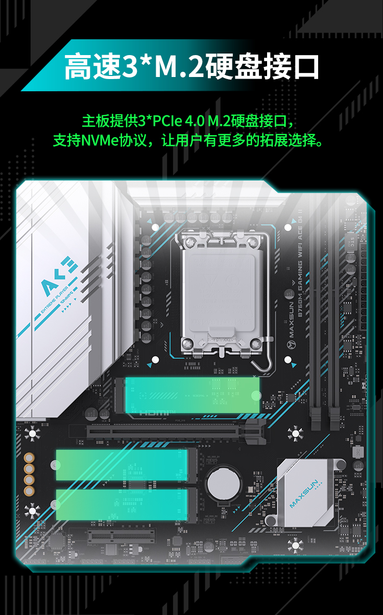 內存方面,銘瑄 B760M GAMING WIFI ACE D4 II 主板搭載2條DDR4內存插槽,最高支持64GB大容量,擁有3600MHz(OC)的超頻潛能,能充分釋放14代處理器的性能潛力,為3A游戲幀率提升、多任務處理提速提供強勁支撐。存儲方面,主板支持高速3*M.2硬盤接口,支持PCIe 4.0 X4通道NVMe協議,玩家可以自由選擇和擴展存儲設備,輕松提升系統性能,加載大型游戲也毫無壓力。