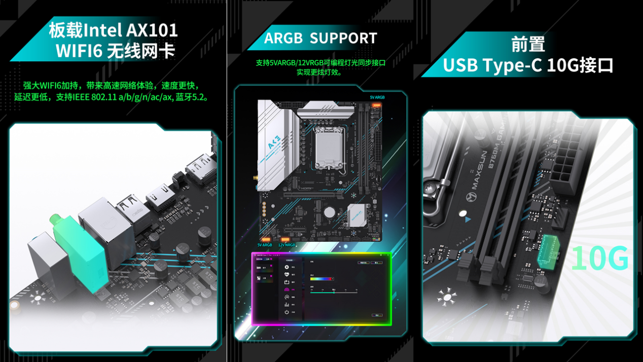 接口配置更是貼心又全面,后置IO接口豐富多樣,涵蓋 DP 1.2、HDMI 1.4 視頻接口,輕松支持 4K 高清輸出,滿足影音娛樂需求;同時配備 2 個 USB 5G 接口、6 個 USB 2.0 接口,足以連接鍵盤、鼠標、硬盤等各類外設。更值得一提的是,主板貼心配備背部 CMOS 一鍵重置按鈕,無需開蓋即可快速恢復 BIOS 設置,輕松解決超頻失誤等突發問題;分布式 DEBUG 燈則能幫助用戶快速定位主板故障,排查問題更高效。前置接口同樣給力,提供 10Gbps 速率 Type-C 接口與 5Gbps USB 接口,適配高速外設接入;支持 5V ARGB/12V RGB 可編程燈光同步接口,搭配 MAXSUN SYNC 燈控軟件,玩家可自由打造個性化光效主機,讓顏值與性能并存。