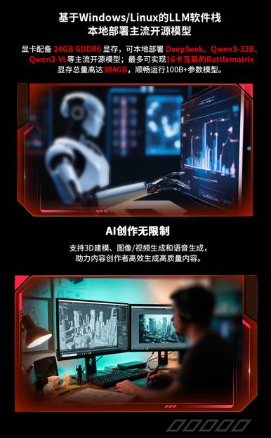 該卡創(chuàng)新采用雙GPU設(shè)計,配備48GB GDDR6超大顯存,支持多種主流大模型部署,包括DeepSeek-r1:70B蒸餾量化版、Qwen3-32B、Qwen3-VL、Qwen3-Coder-30B等,并原生支持Pytorch、ISV支持、IPEX-LLM推理引擎、適配vLLM,滿足不同場景下的高性能運算需求。