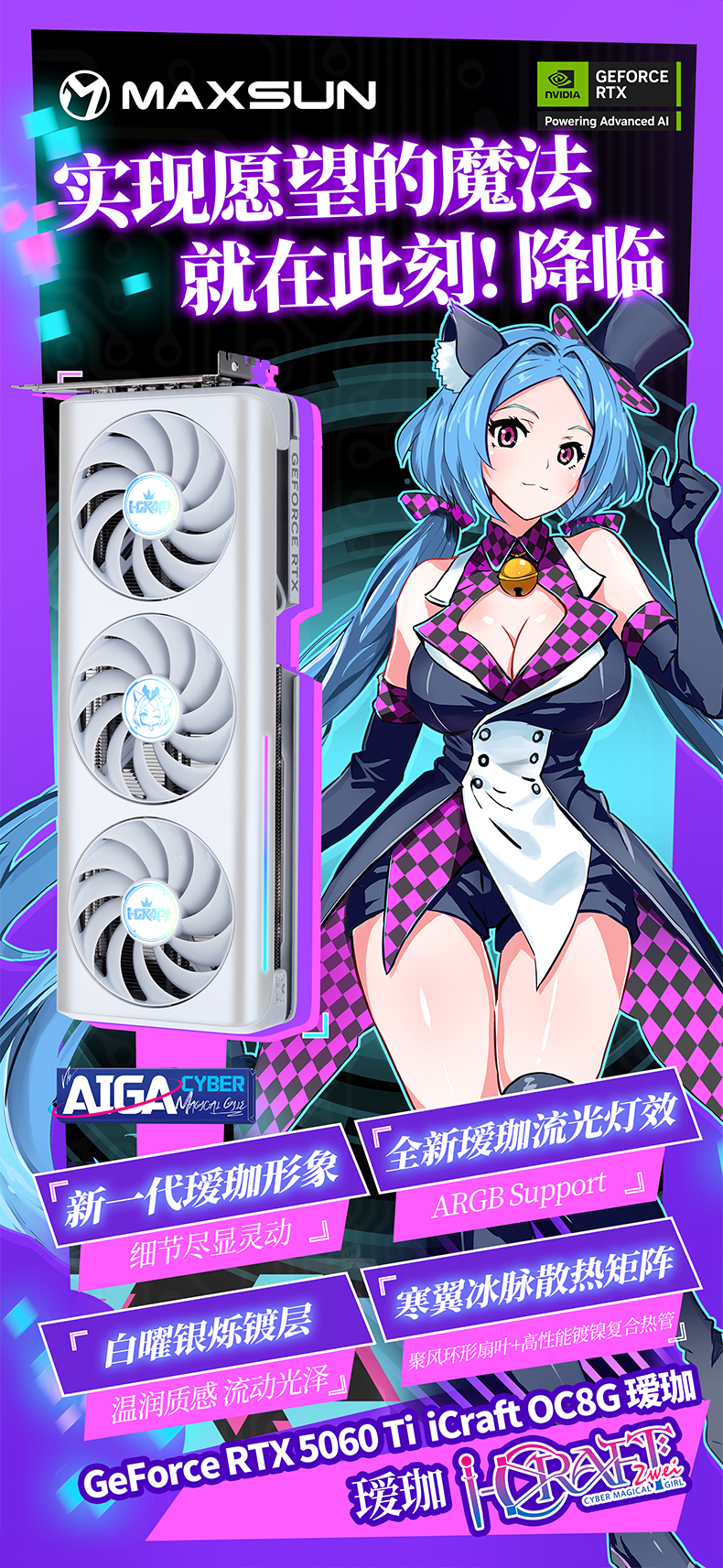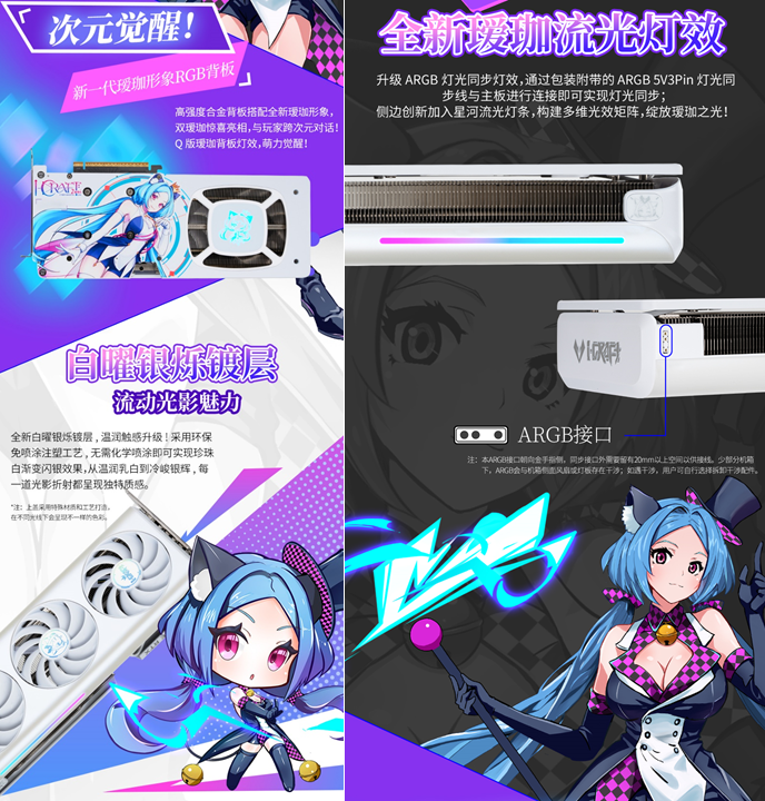 不僅性能能打,銘瑄GeForce RTX 5060 Ti iCraft OC8G 璦珈顯卡的顏值更是戳中玩家審美。全新白曜銀爍鍍層,溫潤(rùn)觸感升級(jí),采用環(huán)保免噴涂注塑工藝,無(wú)需化學(xué)噴涂就能呈現(xiàn)珍珠白漸變閃銀效果,從溫潤(rùn)乳白到冷峻銀輝,每一道光影折射都獨(dú)具質(zhì)感。搭配側(cè)邊創(chuàng)新加入的星河流光燈條,構(gòu)建出多維光效矩陣,配合升級(jí)的 ARGB 燈光同步功能,只需通過(guò)包裝附帶的 ARGB 5V 3Pin 燈光同步線與主板連接,就能實(shí)現(xiàn)燈光聯(lián)動(dòng),讓主機(jī)機(jī)箱瞬間變身 "次元舞臺(tái)"。高強(qiáng)度合金背板暗藏巧思,全新Q版璦珈形象涂裝萌趣十足,與正面白調(diào)形成呼應(yīng),個(gè)性化拉滿。
